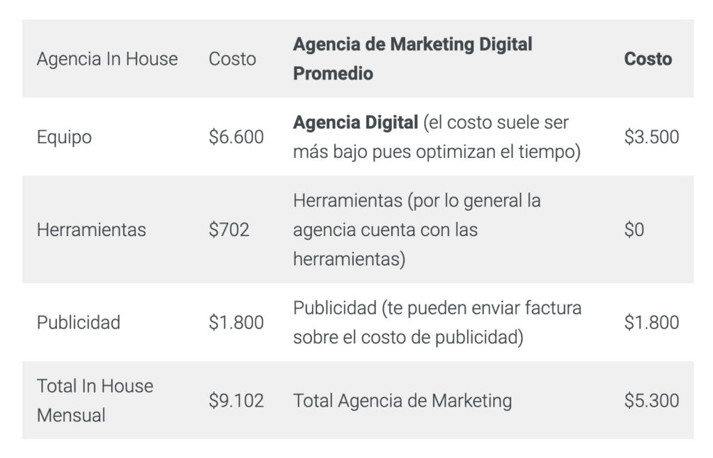 Learn how hiring a marketing agency can optimize your Facebook Ads strategy.Comparativa de costos